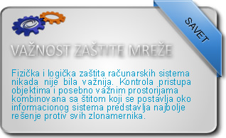 Firewall Zaštitni programi ili uređaji (software and hardware firewalls) su opšteprihvaćeni i korišćeni bilo na radnim stanicama ili kao uređaji koji se postavljaju kao odbrambeni mehanizam kojim se brani integritet računarske mreže, podataka i servisa. Ukoliko niste sigurni da vaš informacioni sistem ima ovakvu liniju odbrane, Asist Centar nudi svoje usluge pri izboru, postavljanju i konfigurisanju firewall-a: Firewall kao zaseban uređaj (Cisco ASA 5500 serija uređaja) ili kao servis na ruterima (Cisco ISR ruteri), softverski firewalli (SmoothWall). |